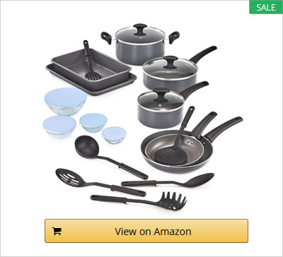 The BELLA 17251 Nonstick Cookware Set offers 21 different pieces, including durable aluminum pots and pans. You will receive 8 and 10-inch fry pans, a 2-quart saucepan, 3-quart sauté pan, Dutch oven, baking sheet, and roasting pan. This set also includes five glass bowls for storage.
