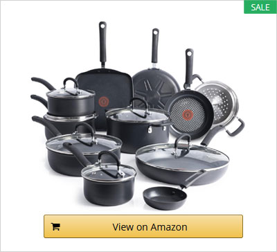 Our top choice is the T-Fal 17-piece Cookware Set, which boasts a tough hard anodized aluminum construction. These pieces heat up quickly and evenly for maximum convenience. They also have a sturdy nonstick interior surface that won’t get scratched up easily. You can count on it to last a long time with no issues whatsoever.
