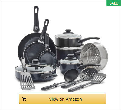 This T-Fal 17-piece cookware set offers two fry pans, a square griddle, three saucepans, a sauté pan, and a Dutch oven. You will also receive a steamer insert that features two side handles.