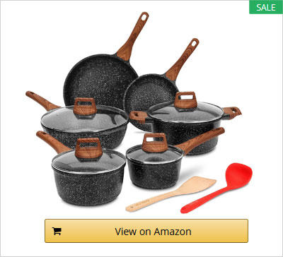 The ESLITE LIFE 12-Piece Pots and Pans Set features a resilient granite nonstick coating. You can count on it to hold up extremely well over the long term. It is PFOA-free and allows you to cook your favorite meals with less oil. This coating will also help save you a lot of time and effort when it comes time for cleaning.