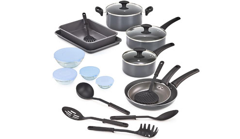 The BELLA 17251 Nonstick Cookware Set offers 21 different pieces, including durable aluminum pots and pans. You will receive 8 and 10-inch fry pans, a 2-quart saucepan, 3-quart sauté pan, Dutch oven, baking sheet, and roasting pan. This set also includes five glass bowls for storage.