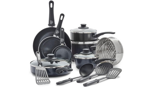 The GreenLife CC005494-001 Pots and Pans Set consist of 17 pieces to meet all of your cooking needs. It features a 4-inch mini frying pan, two saucepans, a 5-quart stock pot, stainless steel steamer, and a variety of kitchen utensils.